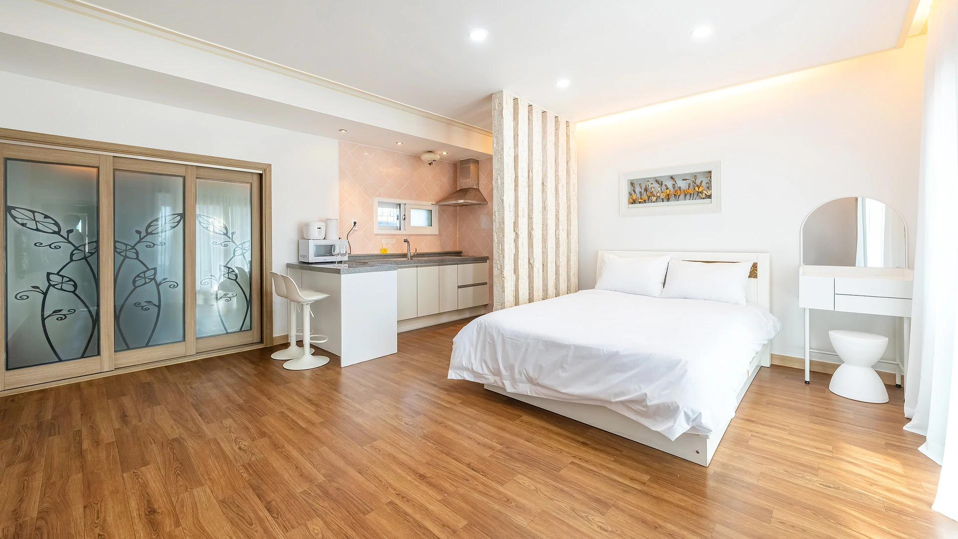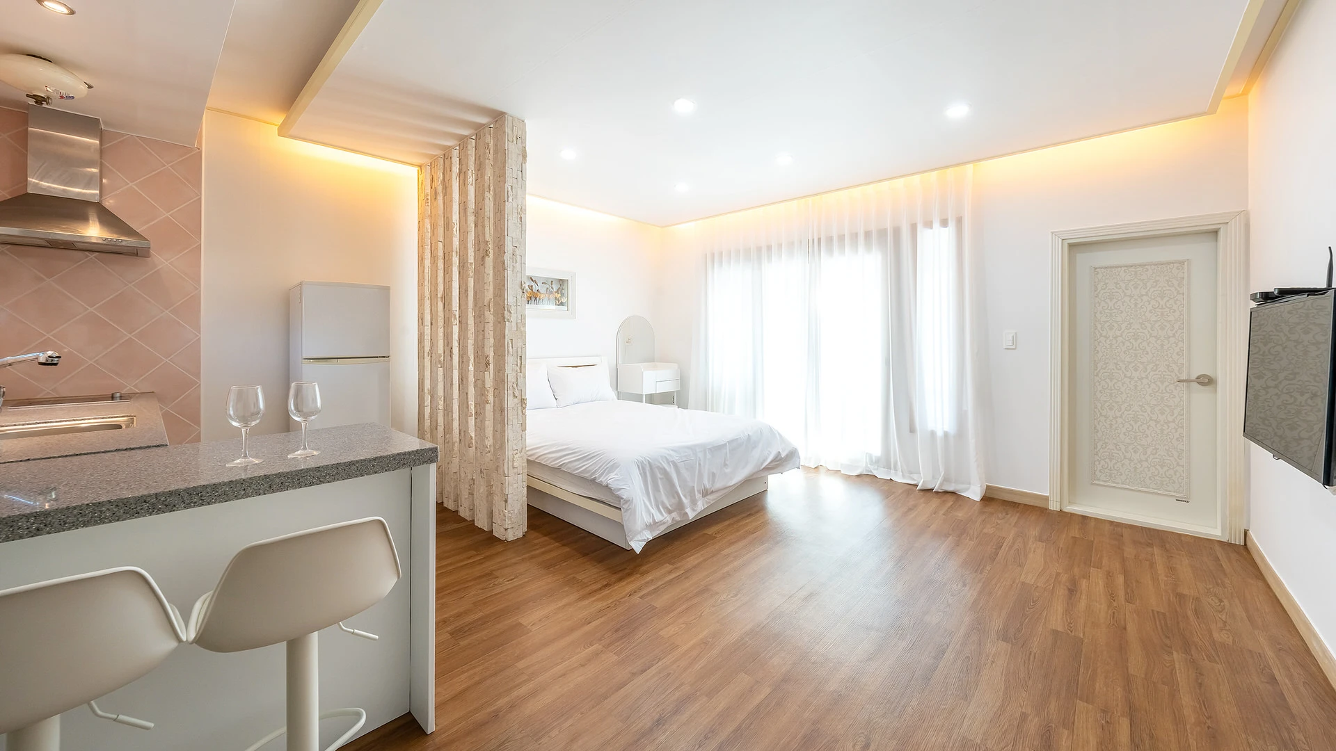 - 집기품목 : TV, 냉장고, 드라이기, 욕실용품, 린스, 무선인터넷, 비누, 샴푸, 에어컨, 와이파이, 인덕션, 전자레인지, 전기밥솥, 취사시설/도구, 침대방, 커피포트, 화장대